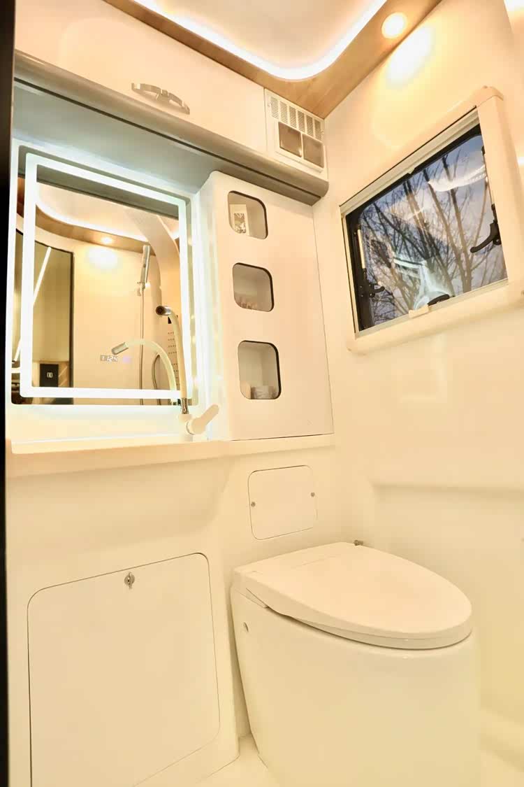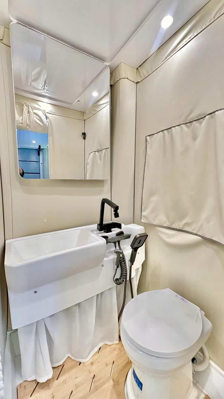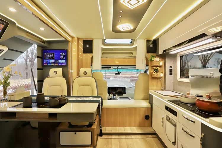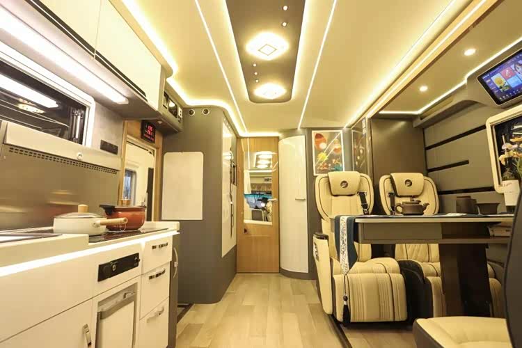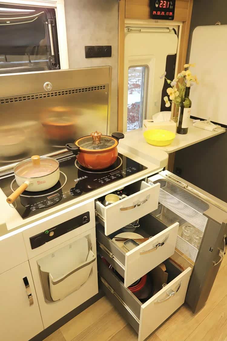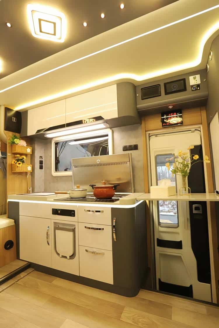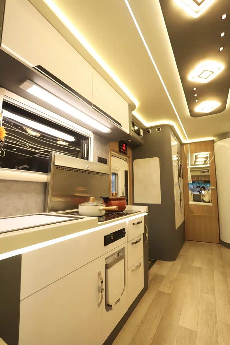 厨房区位于中门一侧,超大操作台面让用户制餐更为便利,区域内配备有嵌入式大容量洗菜池、水龙头(冷热水可调、角度可调节)、电磁炉、微蒸烤一体机、下吸式油烟机、房车专用反渗透净水器等,智能生活设施丰富。