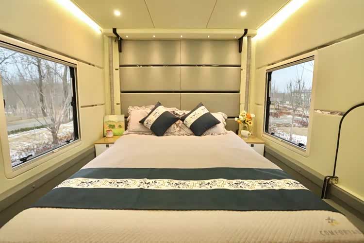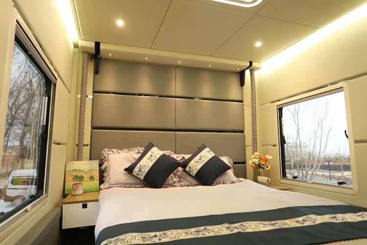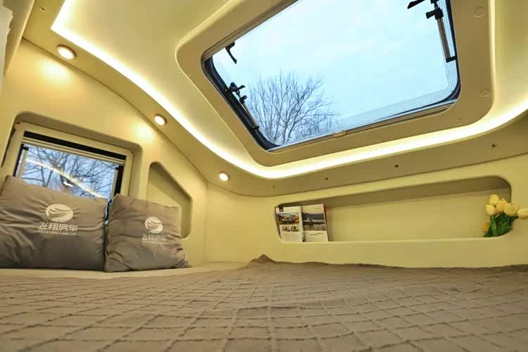 主副驾驶座椅为皮革包覆,其中副驾驶座椅可折叠。驾驶舱上方为抽拉额头床,展开后床铺尺寸可达2.2×1.4m,两侧的外推窗和顶部大尺寸天窗带来了充裕的采光。区域内为用户配置了氛围灯、置物格等设施,让用户可以舒适使用。
