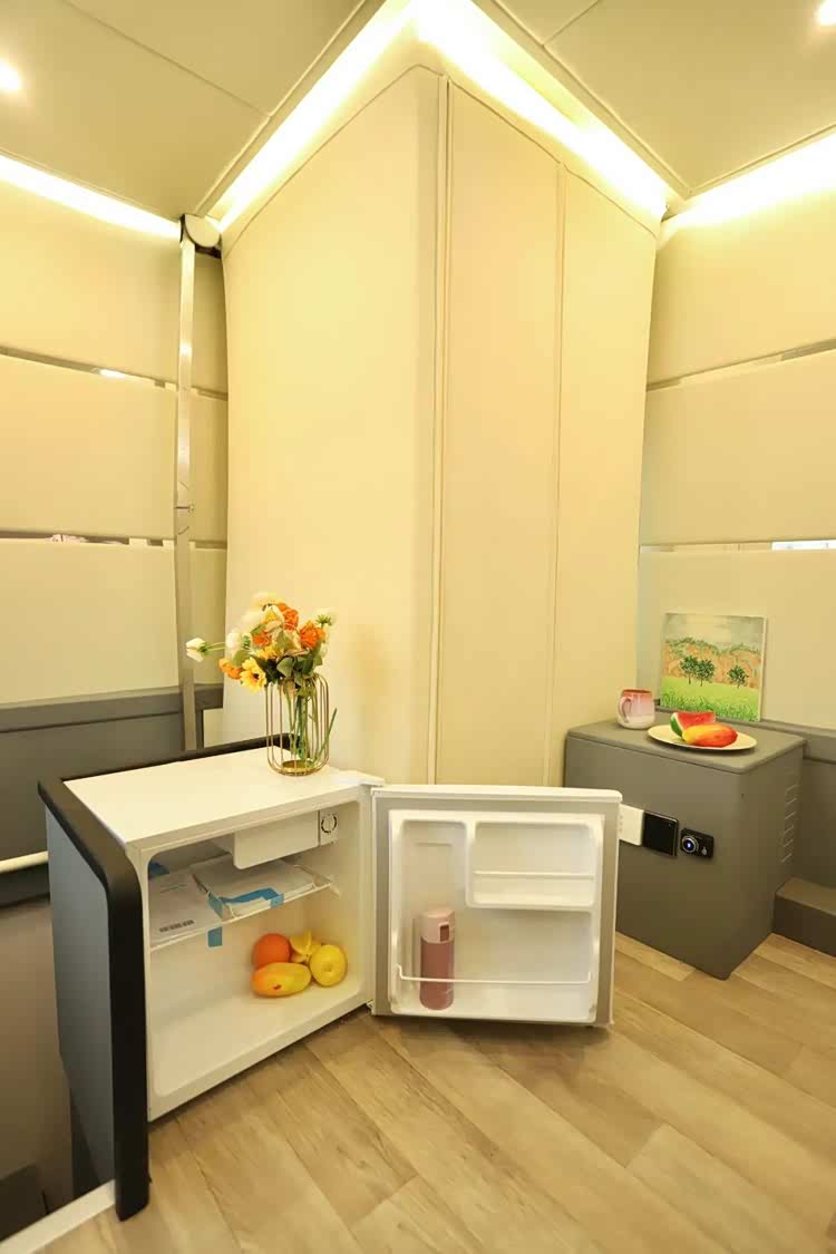 空间两侧均设计有大尺寸的双层中空亚克力外推窗,驻车后可外推打开,为二楼带来极佳的采光和通风。区域内还设计有独立供暖、中央空调出风口以及单开门小冰箱,保障了用户使用的舒适性。
