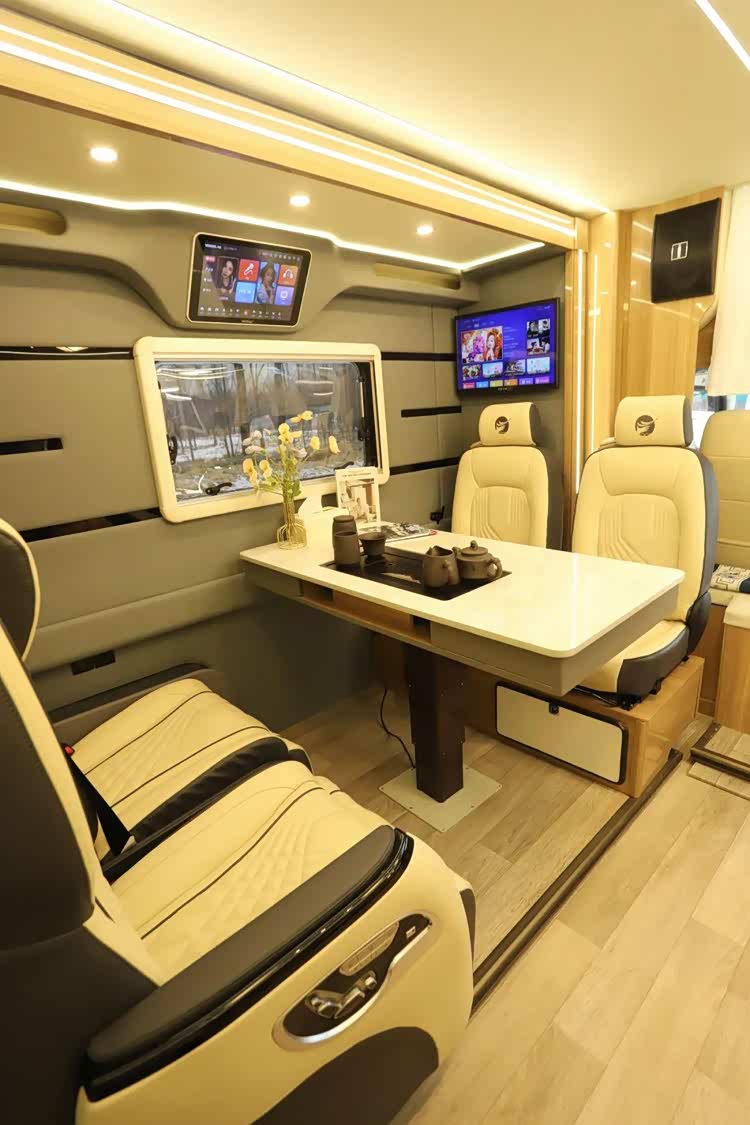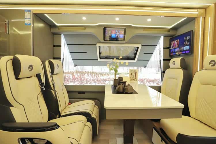会客区为对坐布局,内含两张豪华航空座椅,附带通风、加热、按摩、USB接口功能、腿托等功能,中间为一键电动升降茶桌,整个会客区可随侧拓结构向外延伸,为用户提供更多的车内活动空间,座椅旁侧为会客区的超大观景窗,驻车后将舱门打开可以为用户提供非常好的观景效果。