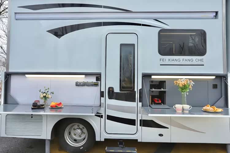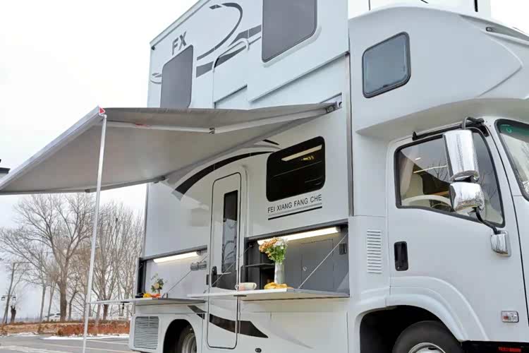 车侧装配有4m电动遮阳棚,下方的两个舱门打开后呈现的是户外厨房区,此外车身还配备户外厨房照明灯、五孔插座(2组)、裙边储物舱、重力加水口、整车电路控制系统、新能源充电口、外接市电口(220V)等实用性设备和充能设施。