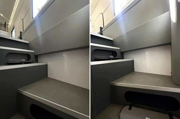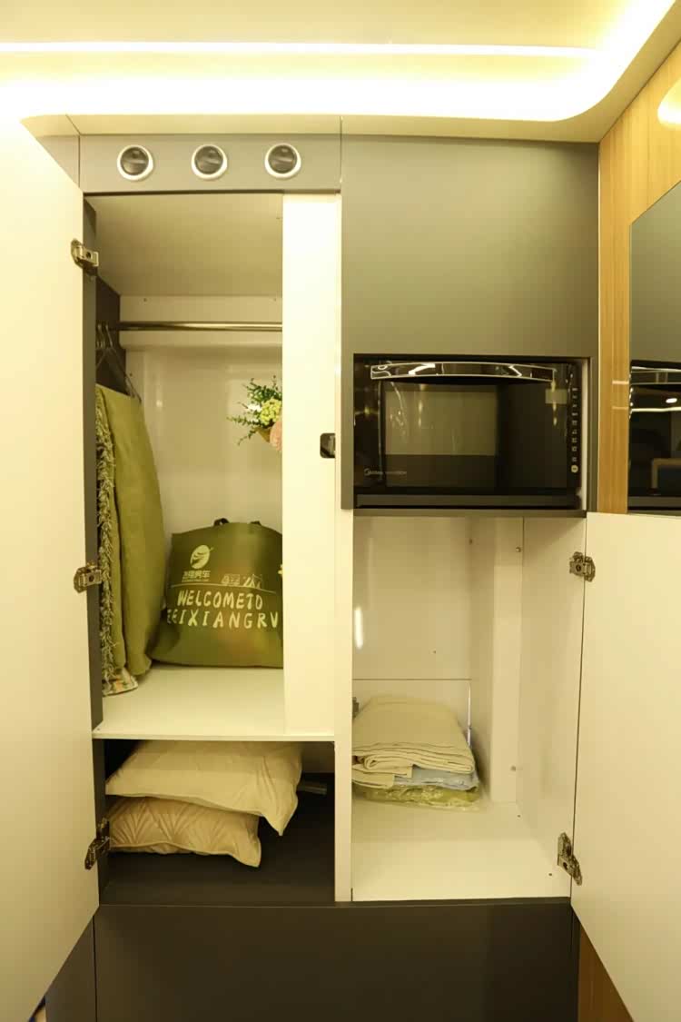 一楼生活区的内部净高度达到1.95m,二楼内部净高度达到2.1m,整车不包括驾驶室可使用面积达到23.24㎡。首先看一层的布局,从前到后依次为会客区+厨房区、大衣柜以及独立卫浴间。