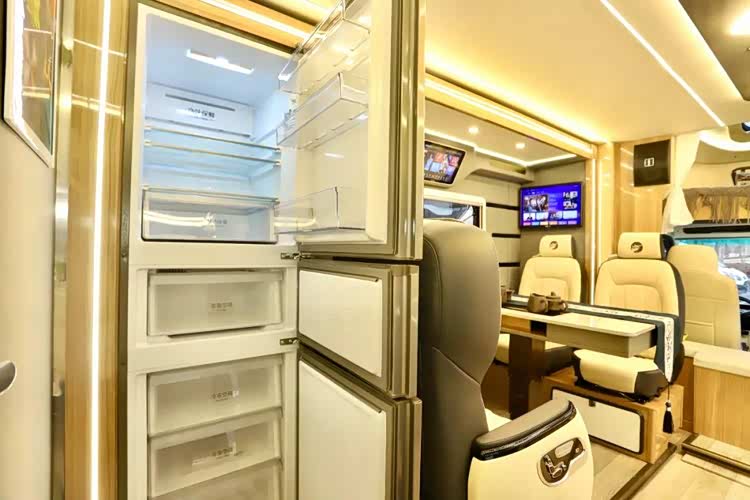 其他生活设备:海尔洗烘一体机(10kg)、单开门冰箱(二楼)、海尔三开门家用电冰箱(253L)、微蒸烤一体机、燃气炉、电磁炉、家庭KTV点歌一体机、网络电视机、独立驻车水暖系统(柴油)、中央空调(分区式送风)、驻车气暖系统(柴油,2组)、房车专用反渗透净水器等