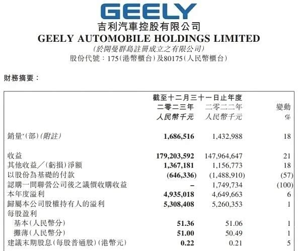除比亚迪外,吉利汽车也交出了双增的成绩单。2023年吉利汽车实现营收1792.04亿元,创历史新高;实现归母净利润53.08亿元,同比微增;毛利总额同比提升31%至274亿,毛利率由2022年的14.1%提升至15.3%。