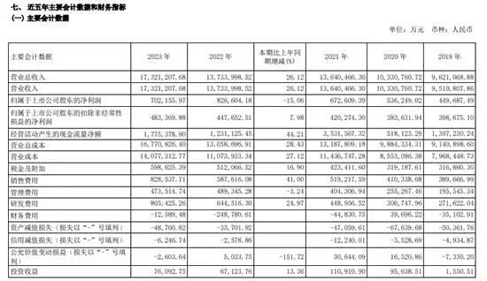 相较于比亚迪与吉利,其余四大品牌则相继承压。其中上汽集团仍是体量最大的汽车集团。2023年实现营收7261.99亿元,同比微增;归属于上市公司股东的净利润为141.06亿元,同比减少12.48%。