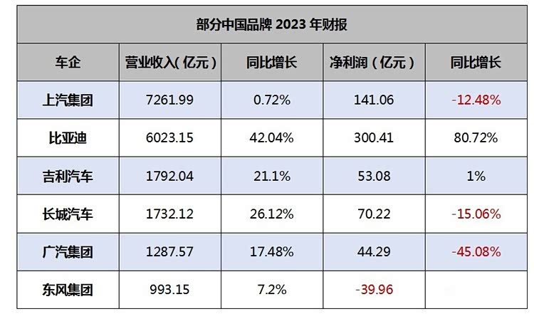 从已经公布2023财报的六大中国品牌来看,仅比亚迪、吉利汽车两家实现营收、净利双增长,上汽集团、长城汽车、广汽集团、东风集团均呈现增收不增利。其中,广汽集团净利润同比几近腰斩,东风集团更是呈现上市18年来首次亏损。