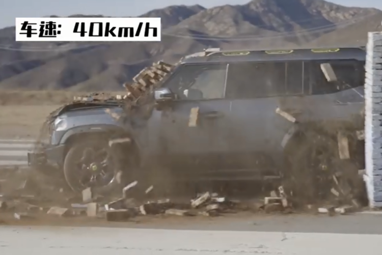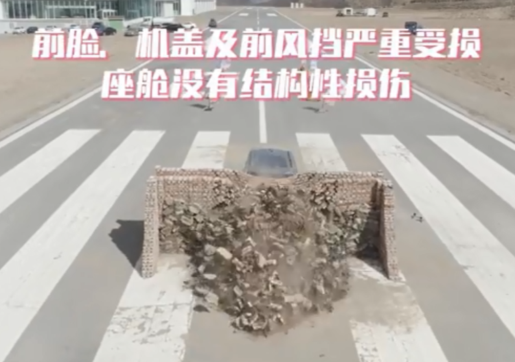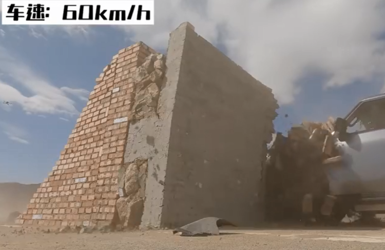 上图就能看到撞击那一刻整个车头穿墙而过的场景,当时时速提升到了60Km/h,一次撞穿,这是未曾想到的,这样的速度下,加上本身就是撞击过一次的车辆,考验的就是整车结构强度本身的优劣了。