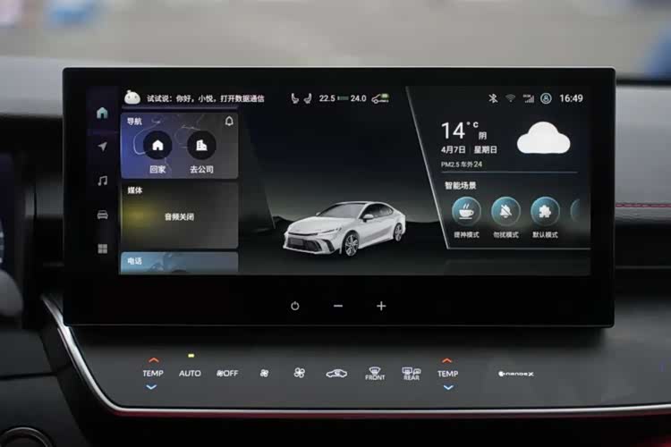 与上一代车型相比,新车在智能化配置方面非常丰富,这也是它为什么被称为“全世界最好的凯美瑞”的重要原因之一。新车搭载8155高通骁龙车机芯片,联手华为开发了智能语音系统和应用生态。高达12GB的运行内存,算力提升超4倍,响应速度提升8倍,约40%的算力冗余,为后续OTA留足空间。车机4秒内完全唤醒,只要喊一句“你好,小悦”就能和车机持续对话,“小悦”能听懂普通话和方言混搭语音,导航、搜索附近美食、播放音乐都不在话下。