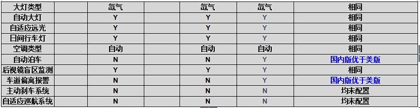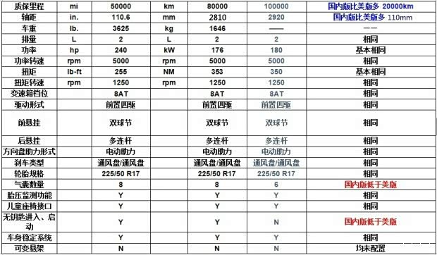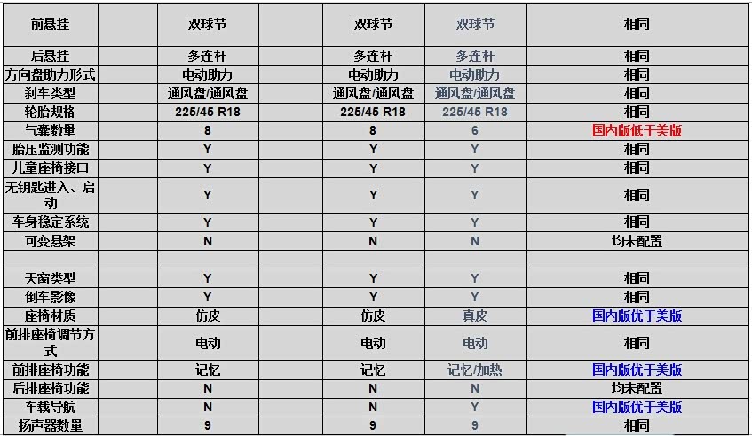 国内版优于美版的配置:质保里程、市区油耗、轴距、天窗、倒车影像、座椅调节方式、座椅功能、车载导航、大灯类型。