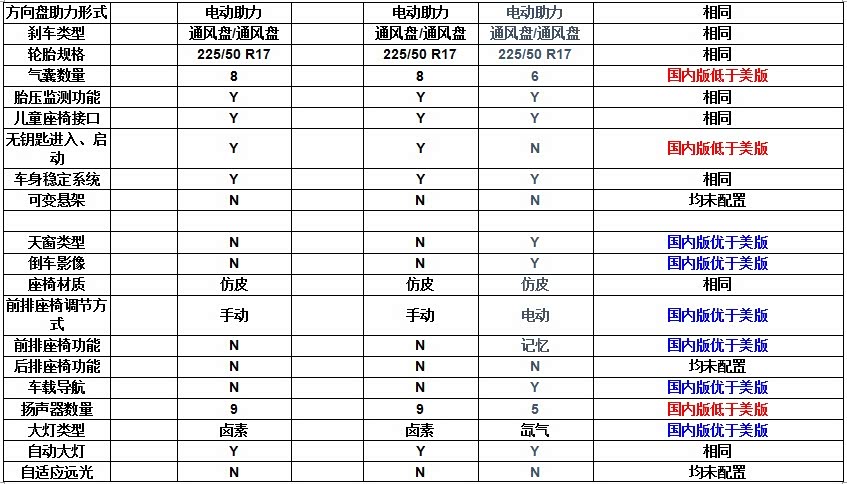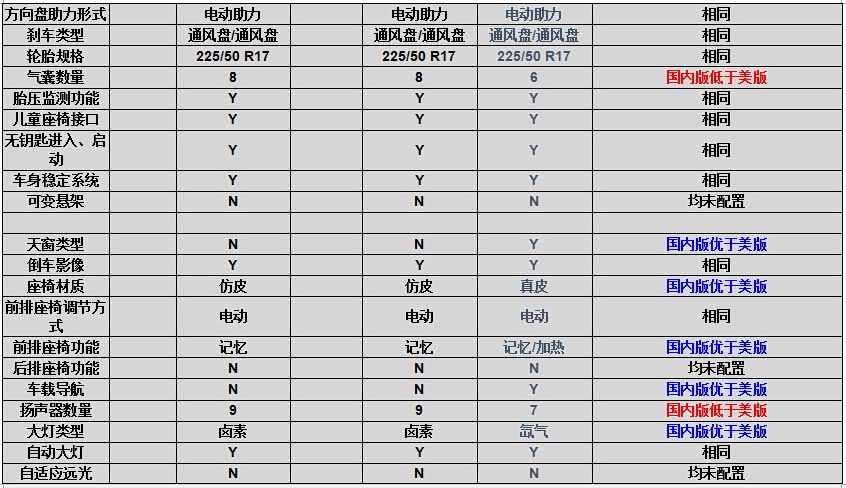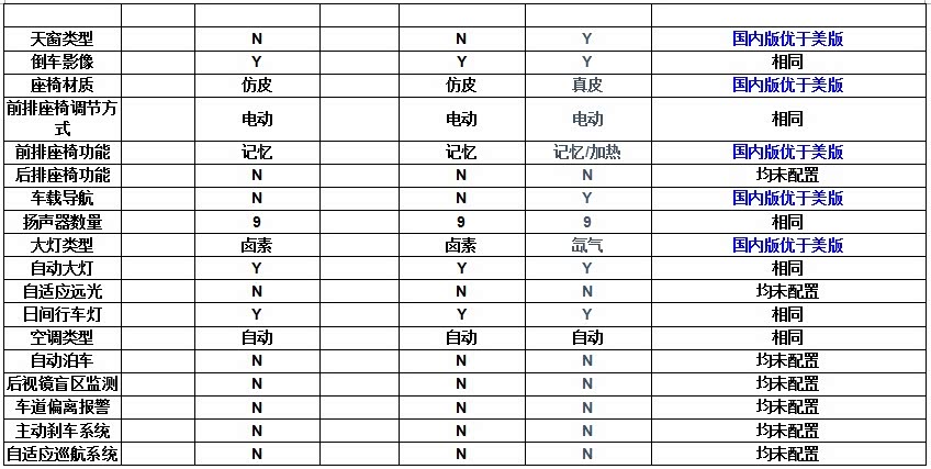 6. 舒适性配置国内版优于美版。天窗、真皮座椅、电动调节座椅、车载导航、高亮度大灯,这些配置在国内普遍高于美版。这一点值得肯定。