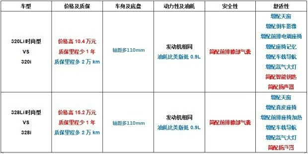 美版328i型与国内328Li时尚型型参数对比见下表: