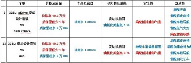 美版335i型与国内335Li豪华设计套装型的比较见下表: