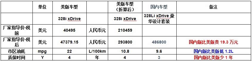 美版328i xDrive型与国内328Li xDrive豪华设计套装型的比较见下表: