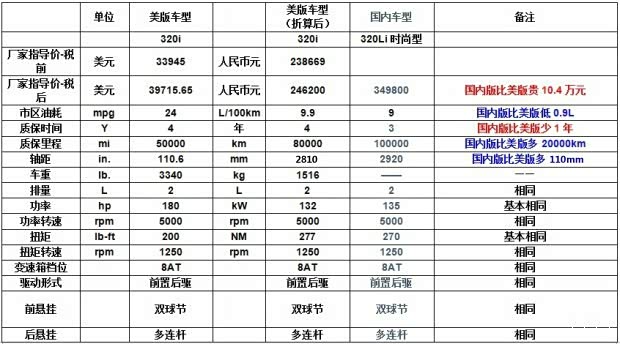 美版320i型与国内320Li时尚型参数对比见下表: