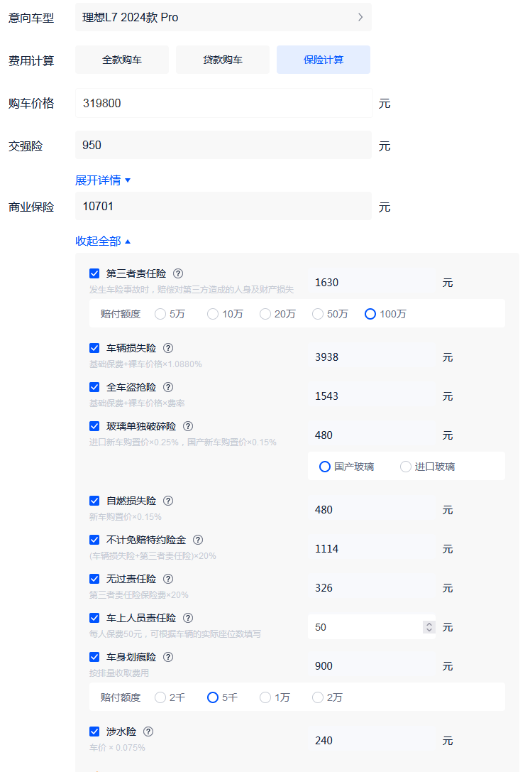 一般在购买完汽车后,还需要购买汽车保险,这样在车辆有所损伤以及意外事故时,一定程度上能减少车主的损失。我们以官方指导价为31.98万元的理想L7为基础来计算保险费用,交强险为950元(新能源车型免征收车船税),商业险当中的第三者责任险按100万来计算,再加上车辆损失险(含不计免赔)以及其他全部险种,首年的保险费用在11651元左右(不同保险公司报价不一样,以实际为准)。