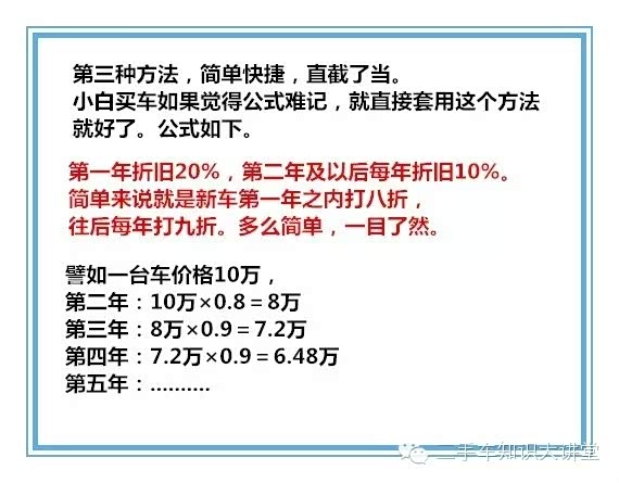 第三种方法就是一个字,快速、便捷。计算公式不复杂,能够迅速让你对一个车子做出一个简单的预估。比较适用于逛二手车市场,面对琳琅满目的二手车,不断变换的车型和价格,直接心算即可。