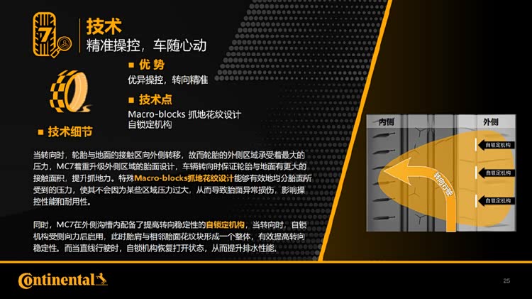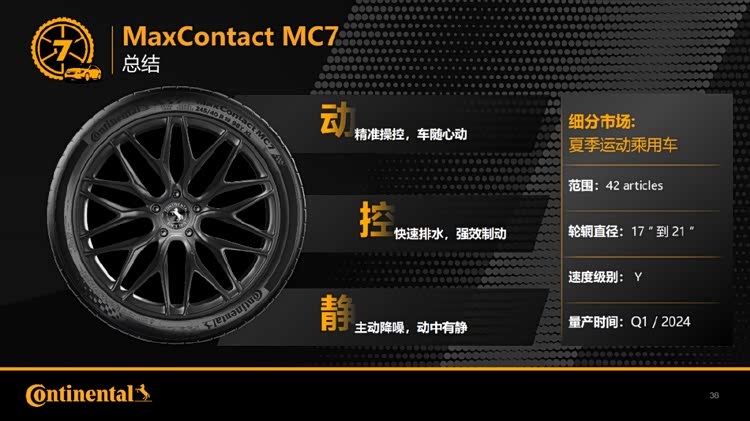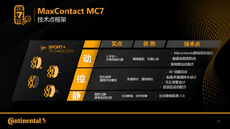 简单来说,全新马牌MC7轮胎的核心优势是三个字:动,静,控。
