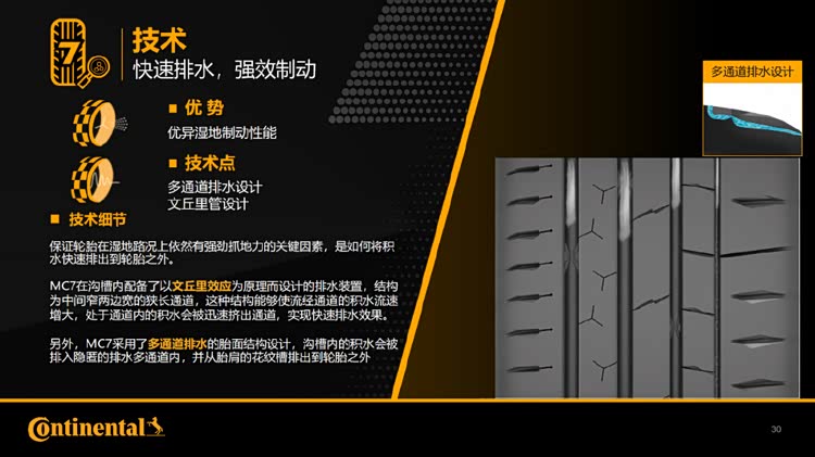 另外,MC7采用了多通道排水的胎面结构设计,沟槽内的积水会被排入隐匿的排水多通道内,并从胎肩的花纹槽排出到轮胎之外。