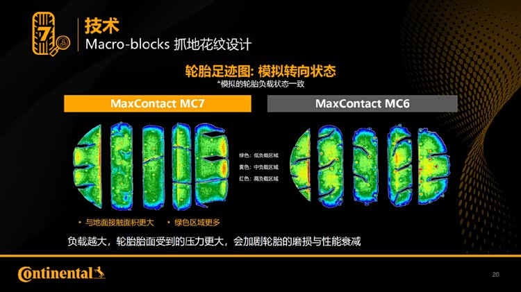 当转向时,轮胎与地面的接触区向外侧转移,故而轮胎的外侧区域承受着最大的压力,MC7着重升级外侧区域的胎面设计,车辆转向时保证轮胎与地面有更大的接触面积,提升抓地力。