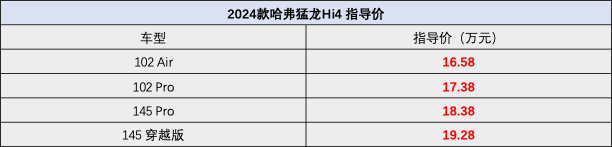 在北京车展前夕,各家车企也开始陆续发布新车。作为长城哈弗旗下的“硬派风格”插混SUV-哈弗猛龙也在4月23日这天发布了自家的2024款车型。新车共有4款车型,指导价区间为16.58万至19.28万,比老款车型多了一款145km的版本。(以下车型配图为:2024款 Hi4 145 穿越版)