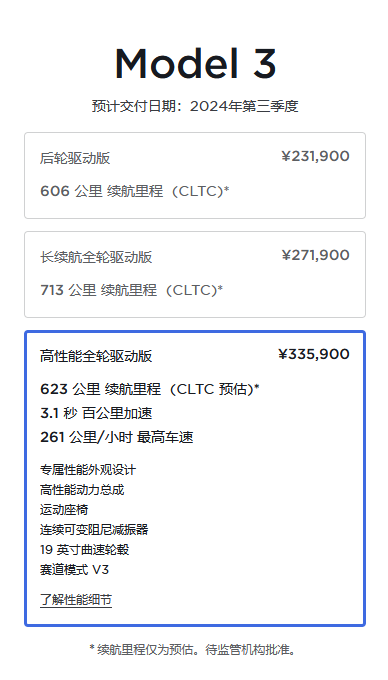 从特斯拉中国官网可以看到新款Model 3 Performance高性能版的价格为33.59万元,预计将于2024年第三季度交付。