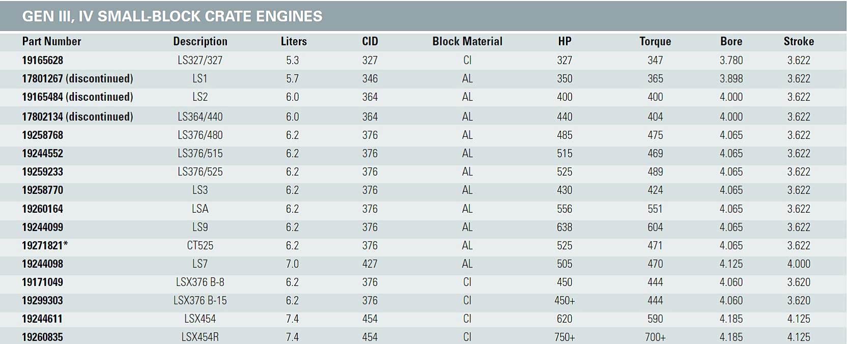 4.060英寸缸径(103.25mm),冲程与LS2相同3.622英寸(96mm)。与LS2都是同一开发平台,是通用替换LS2的更新系列。