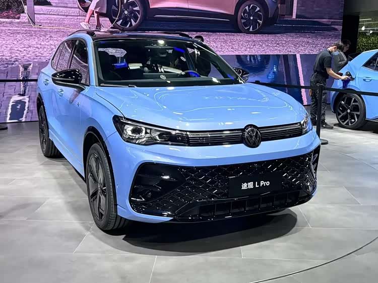 在车展现场我们注意到,途观L Pro的前脸采用了最新的家族式设计风格,镀铬装饰的中网贯穿整个前包围,两侧包含标志性的进气口,前大灯组采用IQ.Light智慧投影大灯,鹰翼式造型通过装饰板将两侧大灯相连。R-Line版本则是在下包围处采用大面积蜂窝装饰,同时格栅处配备有“R”标识,整体运动感十足。