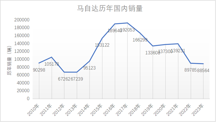 但是,我们也要认识到,它在燃油车时代所立下的“人设”,本身就是一个相对小众的个性化品牌。哪怕是在马自达的鼎盛时期,其年销量也不过192053台(2017年)的水平,马自达在国内更长的时间里,年销量是在大约6-15万左右的区间波动的。
