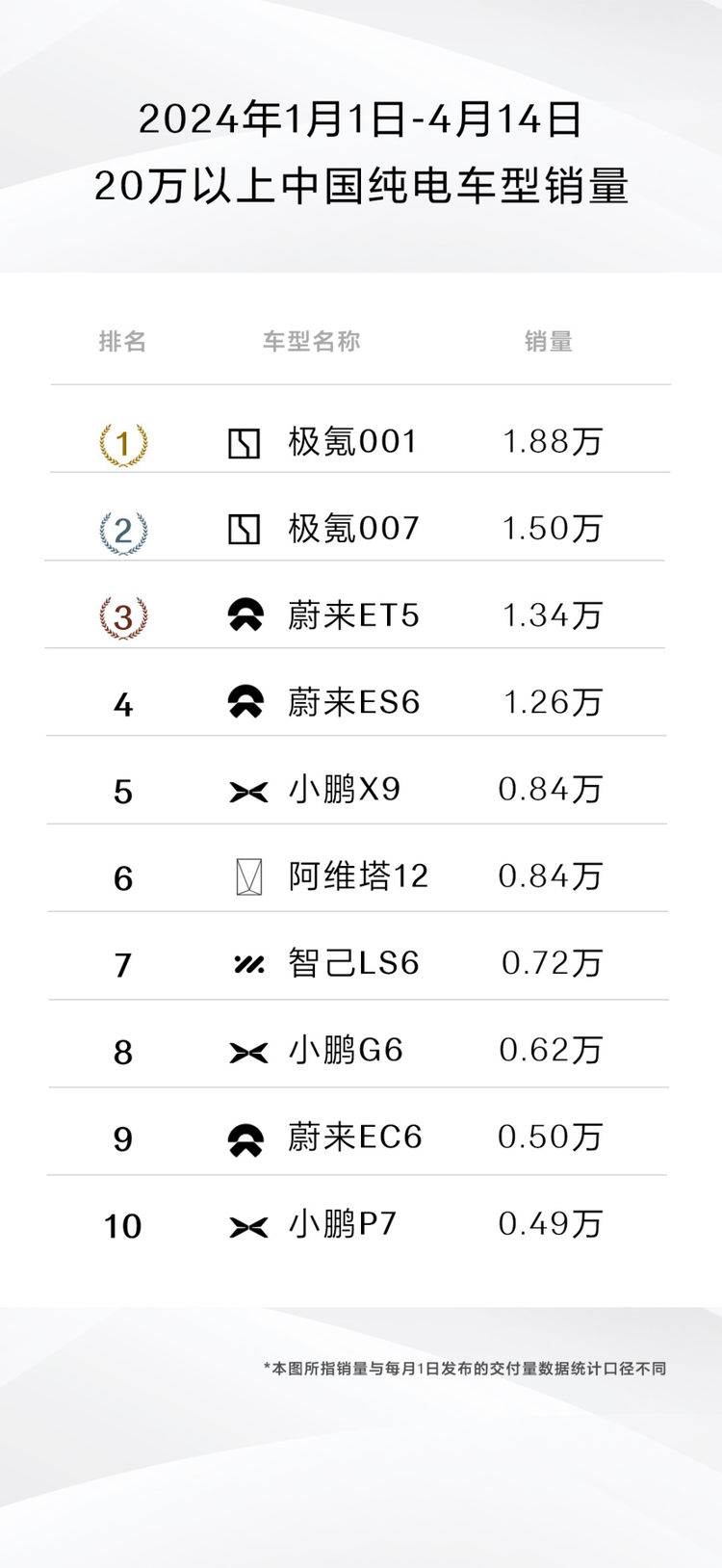 截至2024年4月14日,极氪品牌在中国纯电动汽车新兴市场中表现优异,销量显著。特别是极氪001,在20万以上的价格区间内,以1.88万辆的总销量脱颖而出,成为销量冠军。极氪汽车持续刷新市场记录,展现出稳健且强劲的发展势头。