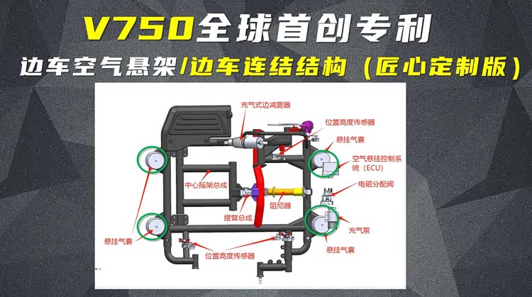 这款长江V750将会在主车架配套KYB减震器的基础上,率先融入了自适应汽车级空气悬挂,让整体结构发生了质的变化。