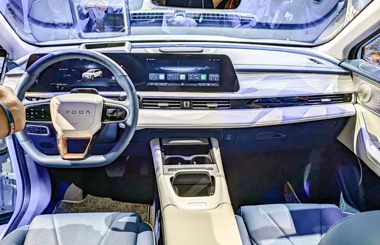 Omoda E5座舱设计相当简洁时尚,中控台造型借由水平线条,营造出加强车宽的延伸视觉,台面上则配置的直立式面板,整合了双12.3英寸的液晶仪表和中央触控屏幕,国内并提供双色对比的内装搭配以添质感。