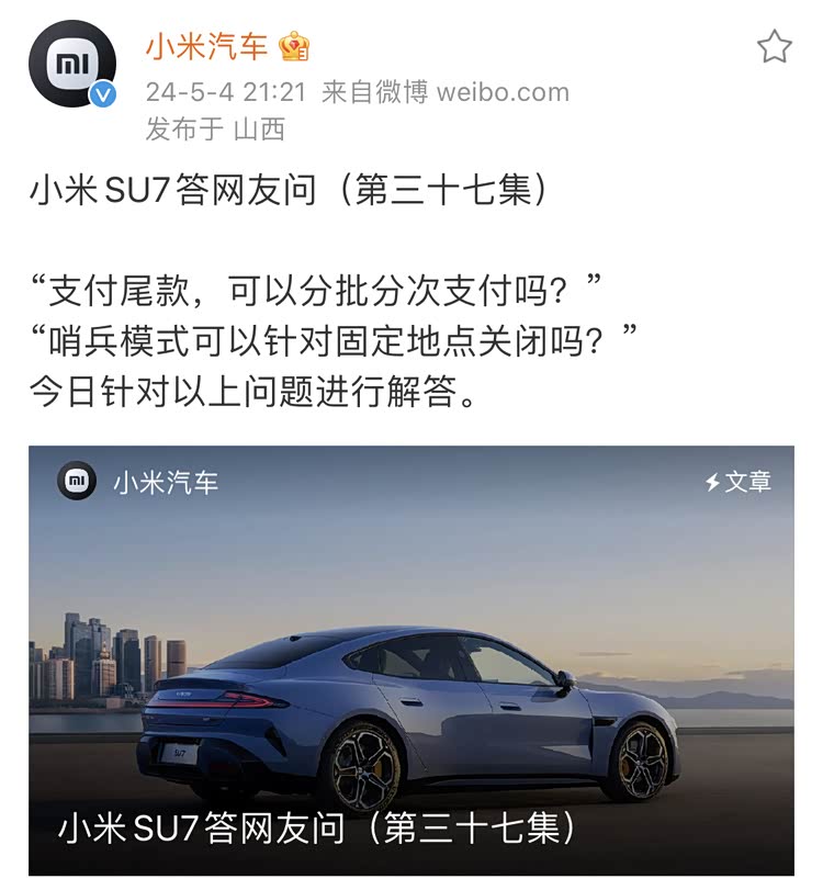 在最新一期的《 小米SU7(参数|询价)答网友问》中,小米汽车提到了“免费换新电池”的相关条件,总体来看与友商的政策没有太大的差异,不过作为自带流量的汽车品牌,小米汽车的最新信息还是引来了广泛的关注。