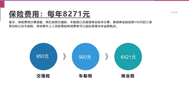 保险费用计算层面,我们按照交强险、车船税以及基础商业险来计算,基础商业险按照100万的三者责任险以及车损险,其它像车上人员险等险种消费者可以视自身情况来选择购买。我们的价格不考虑多年不出险的市场折扣价。