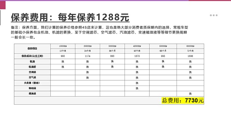保养层面,新车基本10000公里或12个月保养一次, 6万公里/6年计算总的保养支出为7730元,按照每年1万公里来计算,平均一年保养费用为1288元,每年2万公里为2577元。
