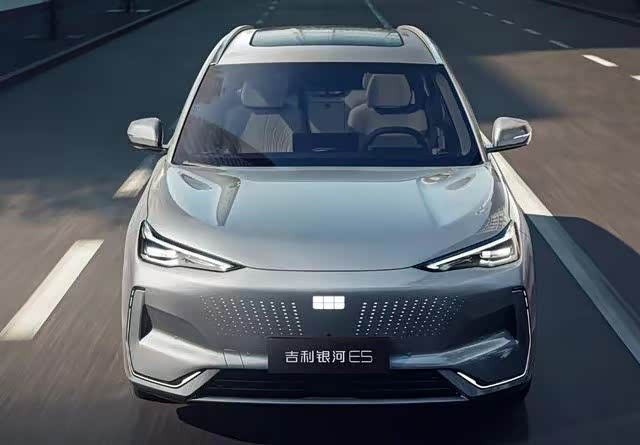 具体来看,银河E5在外观上与银河E8采用相同的点阵式格栅、发光logo。大灯造型犀利,雾灯格栅部分还布置了C型的日间行车灯作为装饰,雾灯格栅部分的处理为新车增加了一些运动感,引擎盖处的筋线为其前脸增加了肌肉感。