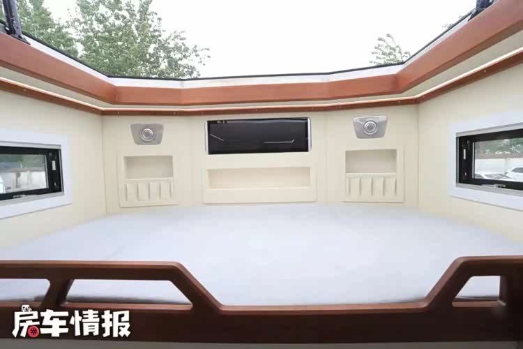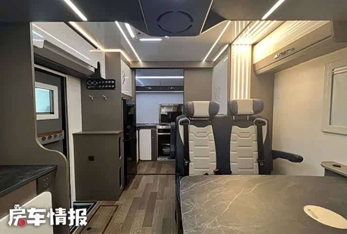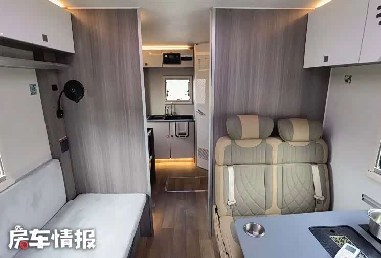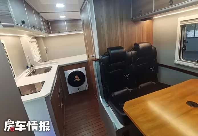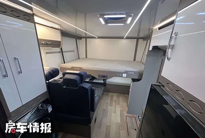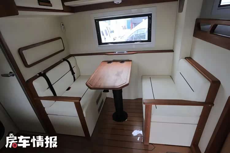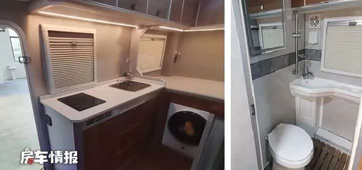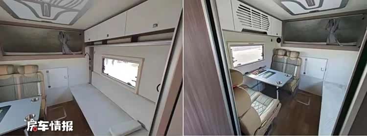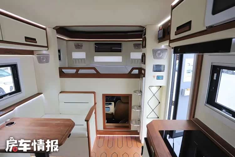 事实上这并不是首款基于此款底盘打造的车型,但这款车新车在设计上却有着很大的创新,尤其是生活区的设计,更是让人打开眼界。生活区的整体设计看起来和主流皮卡房车类似,前方是会客区,后方是厨房和卫生间,驾驶室顶部还有一张额头床,精致的做工也比较符合这种车型的定位。