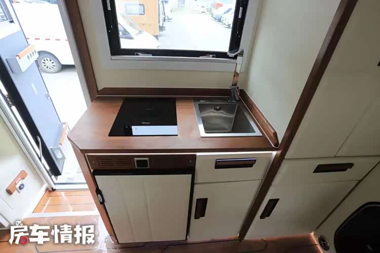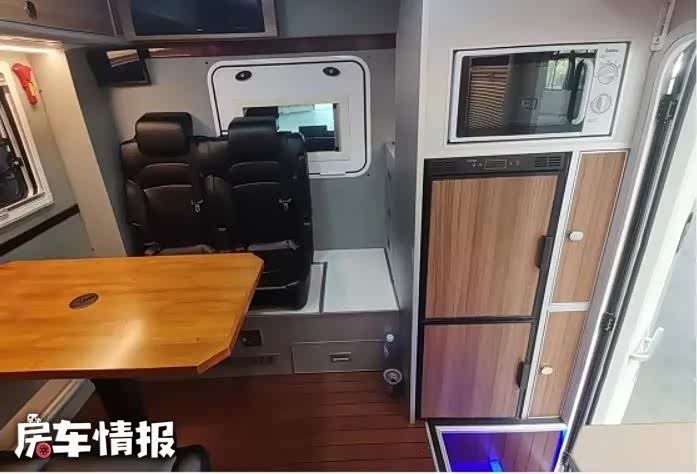关于生活区的设计,就要常规一些,采用了一个后置独立厨卫的设计,并且厨房和客厅由一扇固定门进行分隔,形成了两个独立的空间,在日常使用的时候可以做到更加舒适,即便是在车内炒菜做饭,对会客休息区的影响也能降到很低的一个水平。