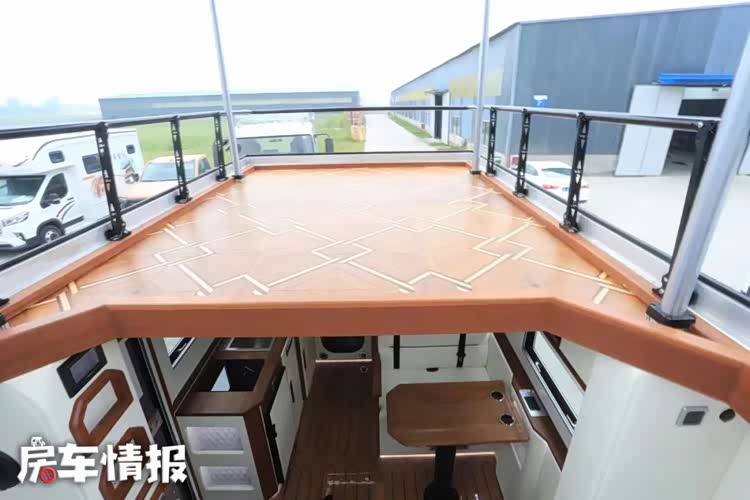 但是当驻车以后,这款车还有另外一个形态,位于车顶部还提供了一个升顶装置,升起来以后,可以将车顶变成一个户外露台,露台底部也采用了类似柚木地板的包覆,豪华感和精致感都很棒。