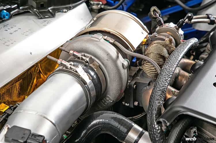 既然要追求更强的性能,自然也少不了强化,DGS团队为这颗引擎配备锻造活塞和连杆,压缩比设定为9.0:1。为的就是对应Garrett GTX3076R Gen.II 涡轮增压,可见Tial 的水冷废气旁通阀从EX歧管聚集区域水平延伸。