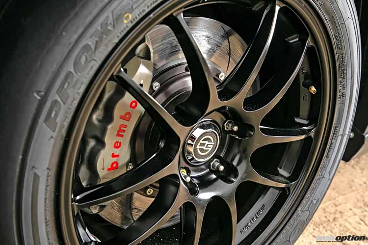 车轮为Enkei的RPF1,轮胎为Toyo的Proxes RR。轮距还加大约127mm,以匹配车身翼子板的宽度。同时前刹车采用Brembo一体锻造4活塞卡钳,搭配355mm制动盘。