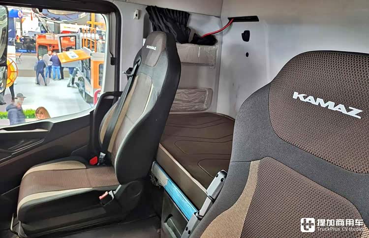 矿用自卸车不需要太大的驾驶室。在压缩车高、兼顾车内空间的需求之下,卡玛兹Atlant-50便采用了低顶长款驾驶室,对应奔驰原厂的ClassicSpace L驾驶室。这款驾驶室虽然采用平顶结构,但依旧带有卧铺,可供驾驶员休息。受宽体底盘等结构影响,车辆的登车爬梯被设计在了前轮后方,爬上后由车身走廊进入车内,颇有点火车的意思。