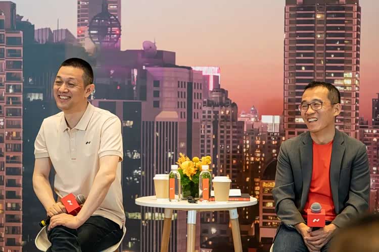 蔚来创始人、董事长、CEO李斌(左)和蔚来高级副总裁,乐道汽车总裁艾铁成