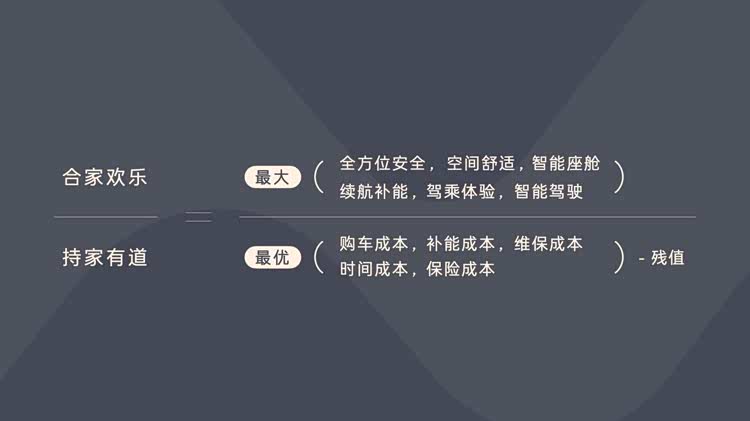 通过对家庭用车真实需求的深刻洞察,乐道确立了定义与开发产品的理念——“合家欢乐,持家有道”,并以此为基础提出了家庭用车全新标准——家庭用车价值公式。通过体验价值的最大化,和拥车成本的最优化,乐道推出首款车型 L60,重新定义了家庭用车的新标准。