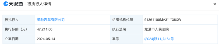 公开资料显示,爱驰汽车成立于2017年,注册资本约8.68亿元,主营科技推广服务业务,由宁波梅山保税港区凯玖投资等企业持股。但多年来,该公司存在多条被执行人、限制消费令、失信被执行人等风险信息,其中最新一条失信信息系2024年1月因违反财产报告制度被上饶法院列入。