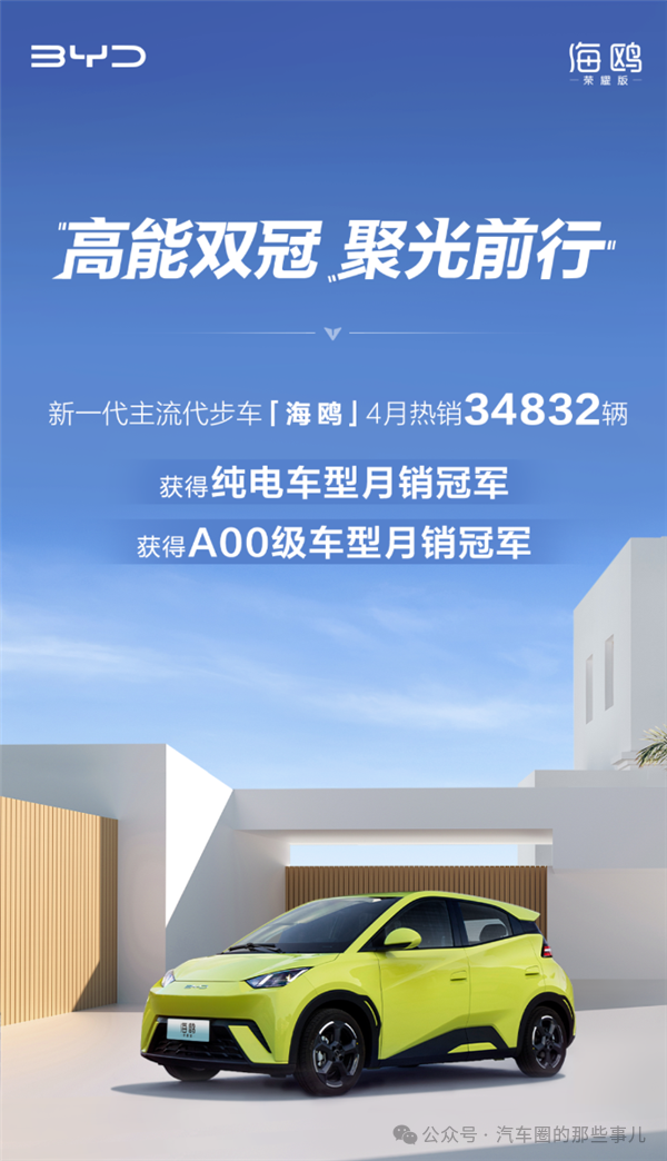 日前,乘联会4月乘用车销量排名公布,新一代主流代步车海鸥以34832辆的成绩荣获纯电车型+A00级车型月销双料冠军,成为近一年多以来,首款夺得纯电车型月销冠军的自主品牌和A00级车型。截至目前,海鸥累销已近40万辆,其强势的冠军表现不仅助力A00级市场回升,并为整个纯电市场的发展注入新活力。