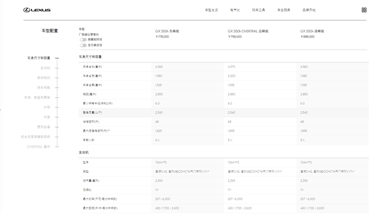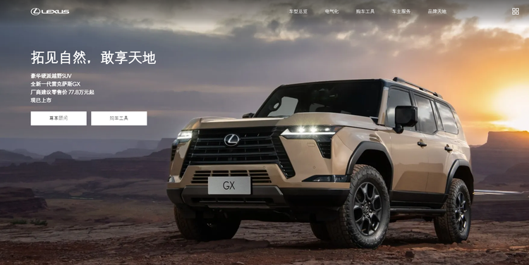 雷克萨斯GX(参数|询价)是一款在车迷群体中有着崇高声誉的豪华越野SUV,虽然由于其高昂的价格导致在道路上非常罕见,但是在车迷圈子中一直受到不少关注。在中国市场,雷克萨斯官网上目前有三款GX车型在售,分别是指导价¥778,000元的GX 550h 先峰版,指导价¥798,000元的GX 550h OVERTRAIL 远峰版,指导价¥888,000元的GX 550h 凌峰版。