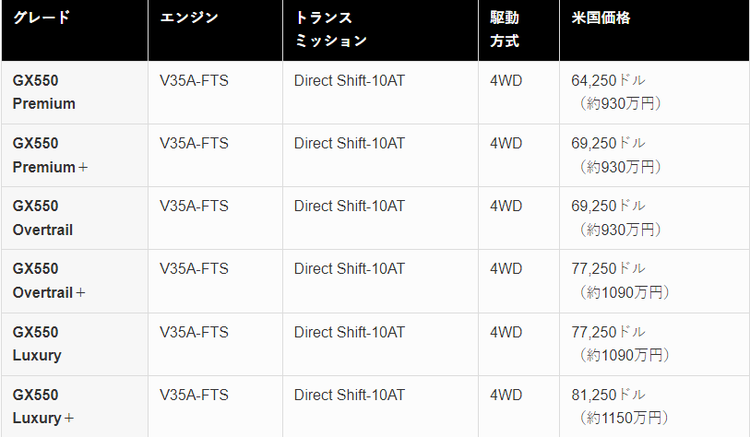 初期在日本市场上市销售的GX550车型采用的是3.5L V6双涡轮增压“V35A-FTS”发动机, 虽然雷克萨斯经销商的销售表上也有混合动力车型,但是交付时间会比采用3.5L V6双涡轮增压“V35A-FTS”动力的车型要晚一些。