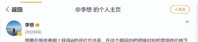 但是李想在社交平台再次揭示了行业“潜规则”,李想表示,想要在维修费用上获得A(良好)评价的方法是,在这个期间把碰撞对应的零部件价格下调,因为中保研碰撞测试的时间是公开的,理想团队行业有过类似建议,但是均被李想否掉,李想认为,实事求是就可以,没有必要“作弊”,得到M评价没问题。