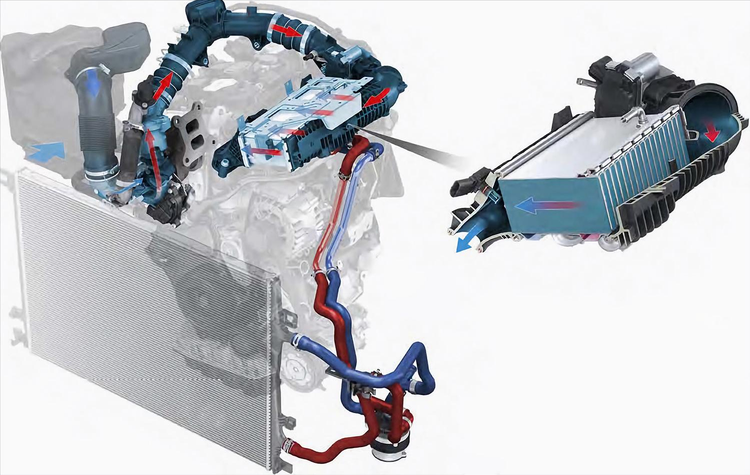 另外,相比以往需要对进气管路进行单独设计,现在全新的EA888 Evo5由于采用了水冷中冷器,Evo5可以不用做横置或纵置平台的单独设计,同时水冷中冷器的加入也意味着拥有相对更好地散热和油门响应效果。