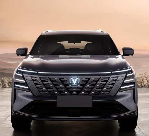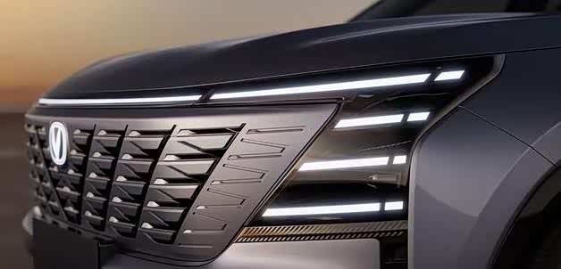 在设计上,新车的前脸焕然一新,引入了新颖的设计理念,与UNI-T车型有着异曲同工之妙。横贯车头的灯带巧妙地与两侧独特的横杠式日间行车灯相融合,形成了独特的远光灯组,尽管并未延伸至前保险杠,但其上半部分的设计恰到好处。中央的倒梯形无边界大嘴格栅与特殊的中网填充和发光的长安车标相映成趣,梯形下格栅则为整车增添了层次感和动感。